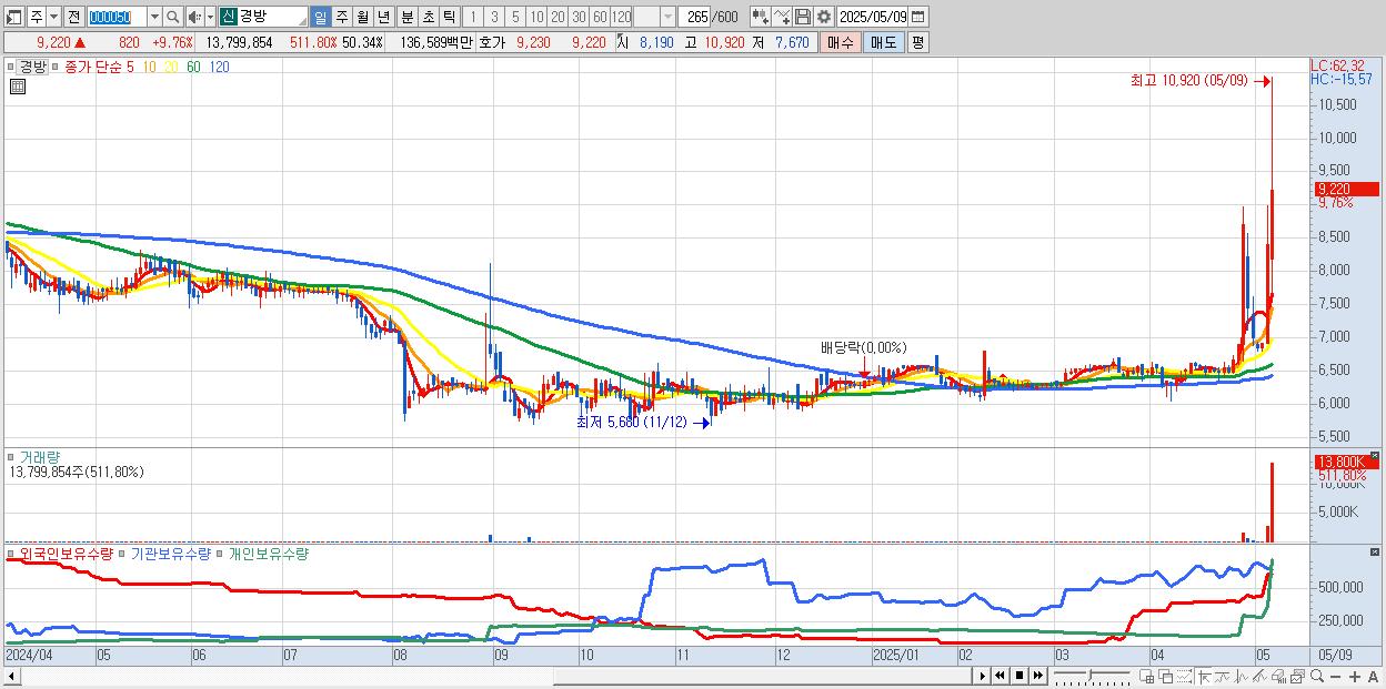 - 경방 (9,220원 ▲ 9.76% , 시총: 2,528억, 거래량: 13,799,854, 거래대금:1,366억)