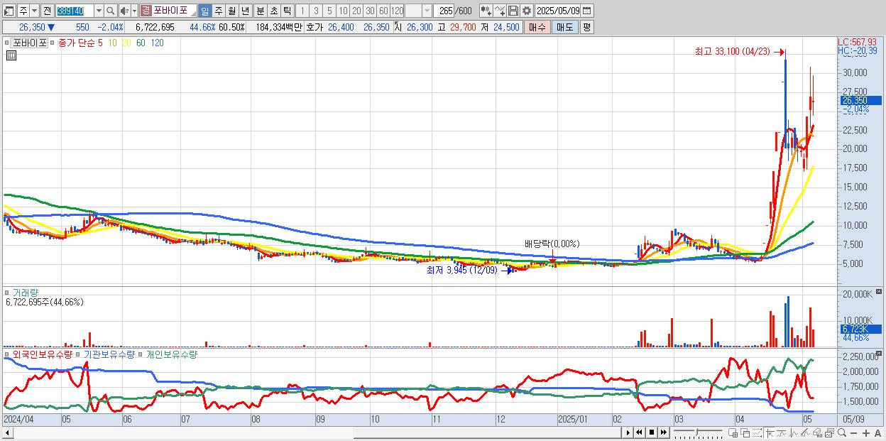 - 포바이포 (26,350원 ▼ -2.04% , 시총: 2,928억, 거래량: 6,722,695, 거래대금:1,843억)