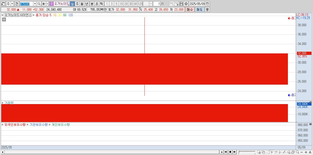 - 오가노이드사이언스 (32,000원 ▲ 52.38% , 시총: 2,082억, 거래량: 24,040,480, 거래대금:7,951억)