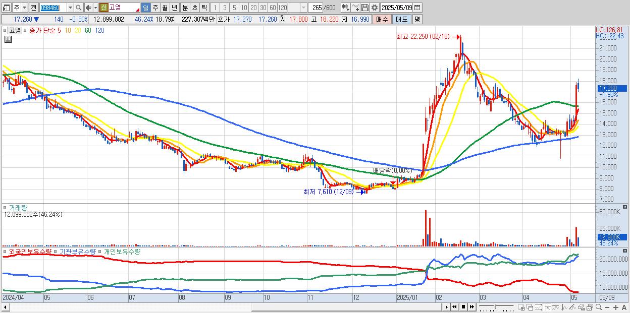 - 고영 (17,390원 ▼ -0.06% , 시총: 11,939억, 거래량: 5,472,363, 거래대금:956억)