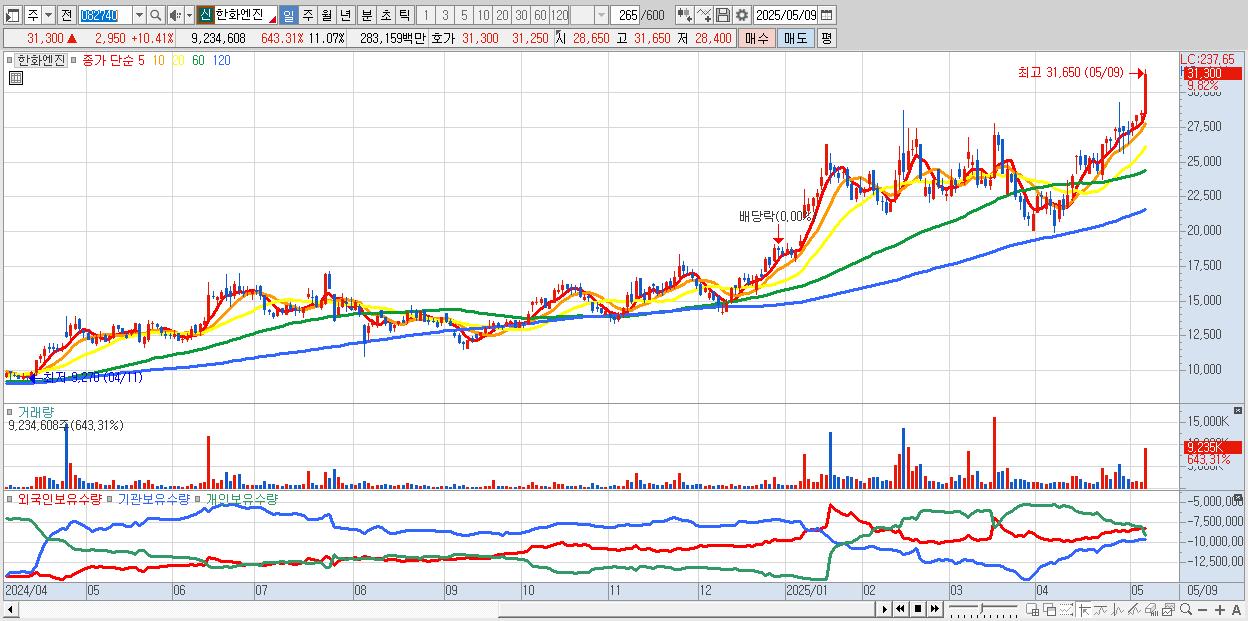 - 한화엔진 (31,350원 ▲ 10.58% , 시총: 26,161억, 거래량: 5,452,879, 거래대금:1,674억)