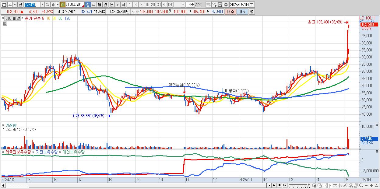 - 에이피알 (102,700원 ▲ 4.37% , 시총: 38,494억, 거래량: 2,792,403, 거래대금:2,866억)
