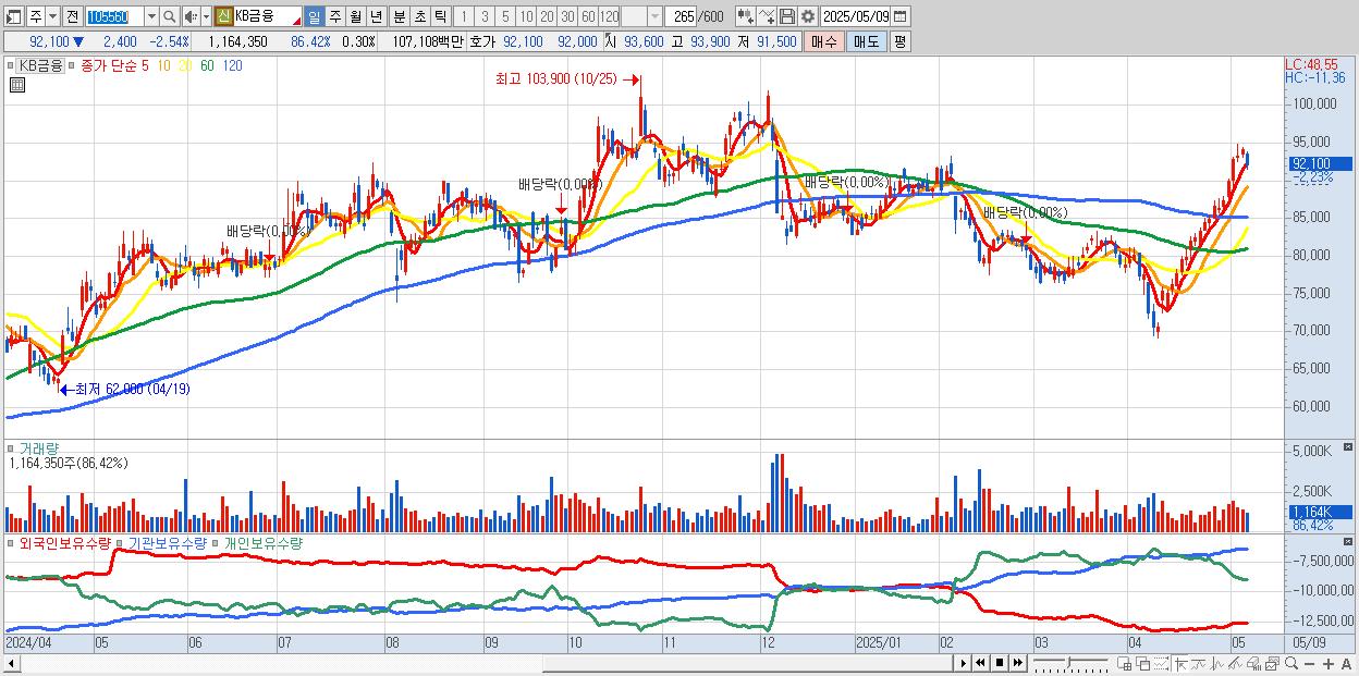 - KB금융 (92,000원 ▼ -2.65% , 시총: 362,046억, 거래량: 1,083,392, 거래대금:996억)