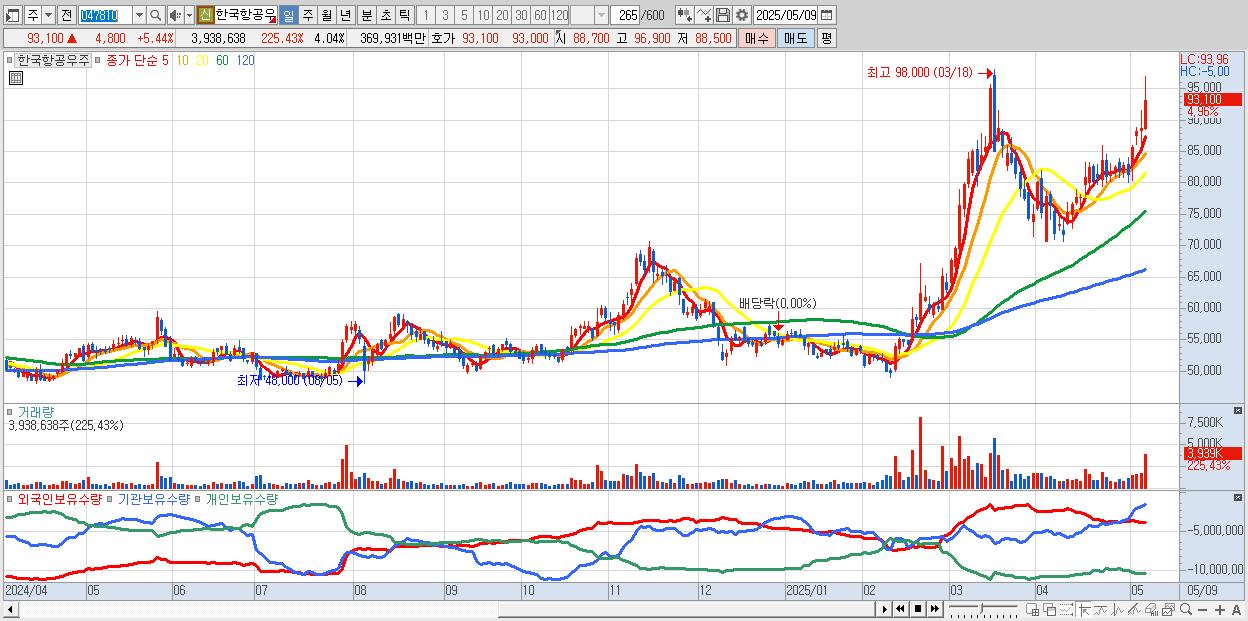 - 한국항공우주 (93,100원 ▲ 5.44% , 시총: 90,749억, 거래량: 2,491,222, 거래대금:2,343억)