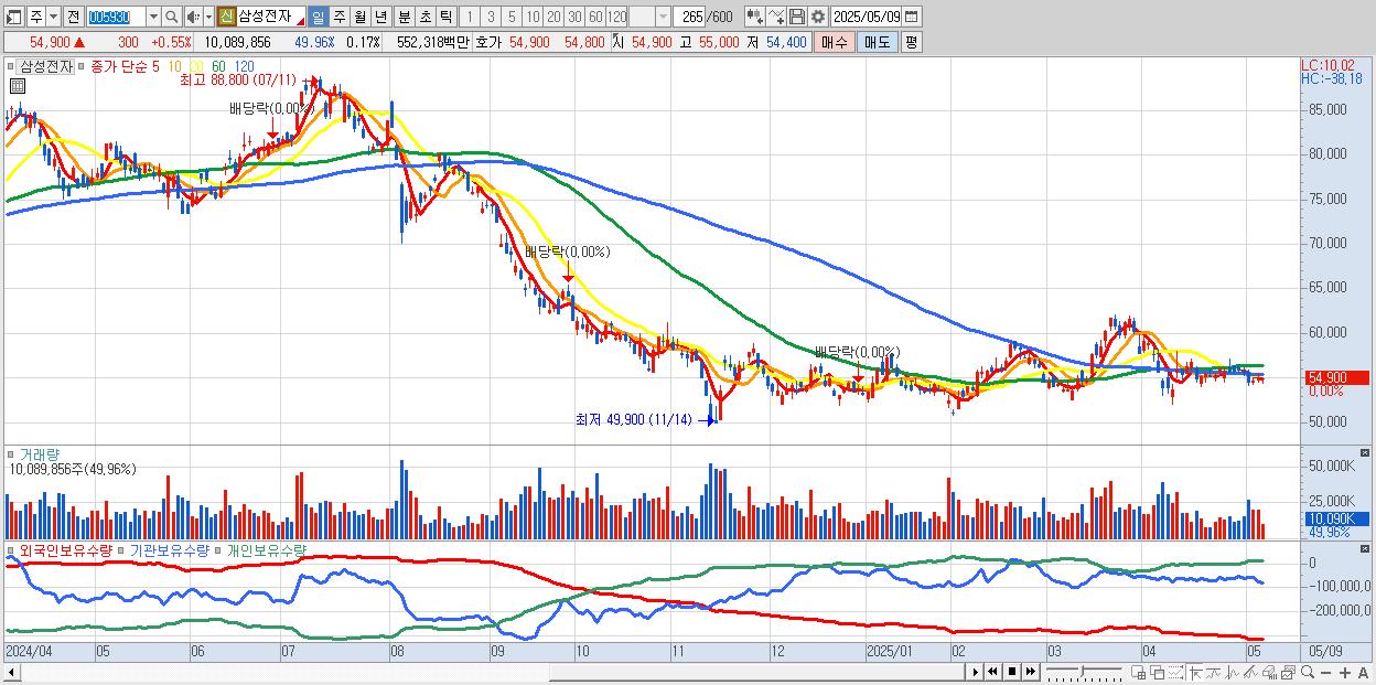 - 삼성전자 (54,800원 ▲ 0.37% , 시총: 3,243,962억, 거래량: 7,814,322, 거래대금:4,277억)