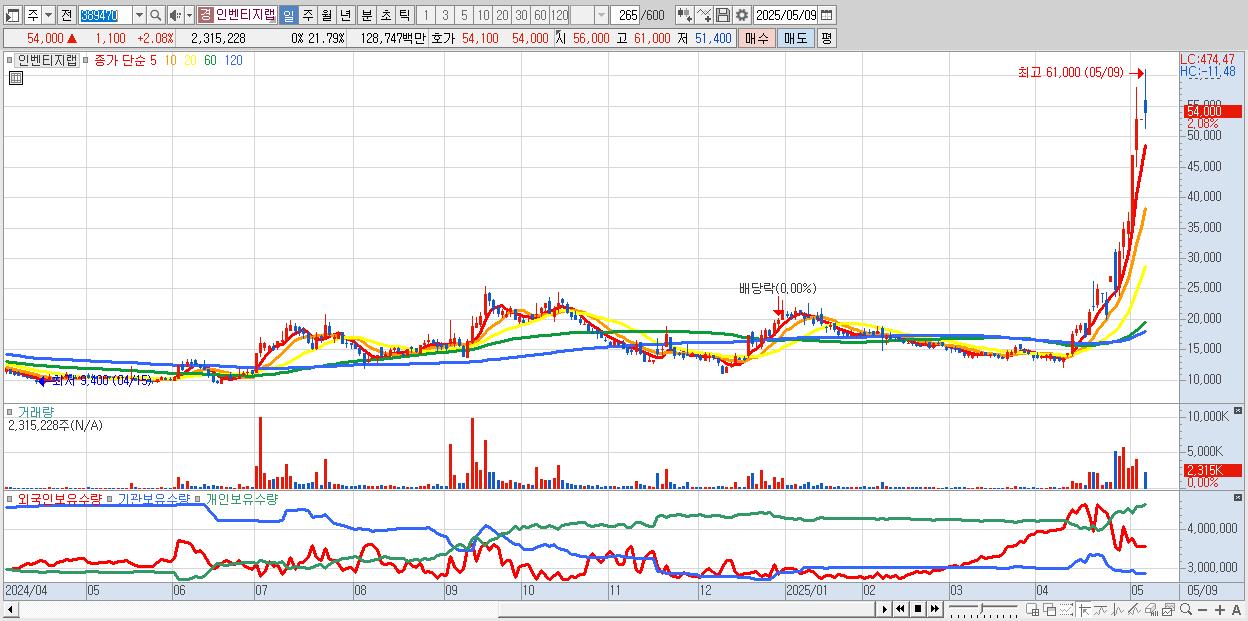 - 인벤티지랩 (54,000원 ▲ 2.08% , 시총: 5,737억, 거래량: 2,315,228, 거래대금:1,287억)