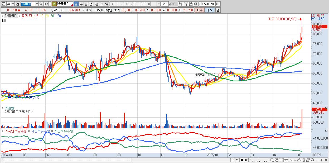 - 한국콜마 (83,600원 ▲ 5.03% , 시총: 19,734억, 거래량: 1,181,581, 거래대금:1,001억)