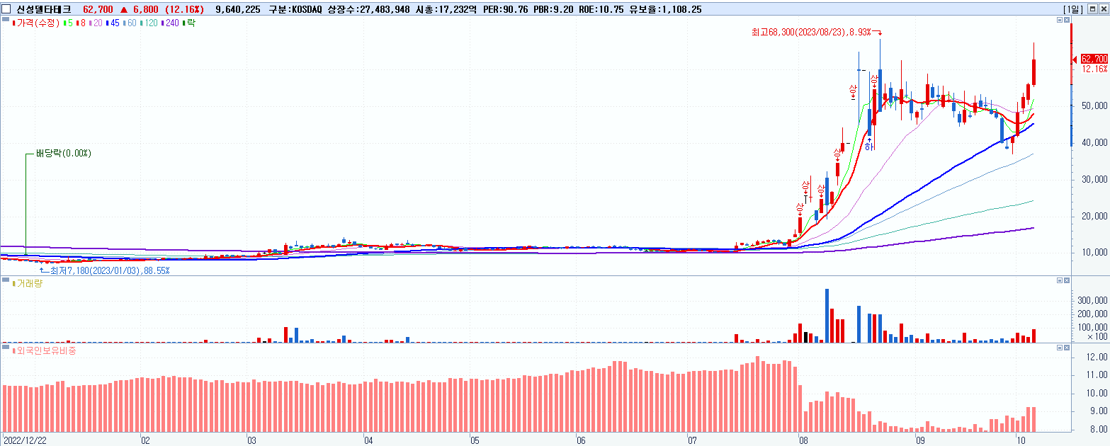- 신성델타테크 (62,700원 ▲ 12.16% , 시총: 17,232억, 거래량: 9,665,139, 거래대금:6,050억)
