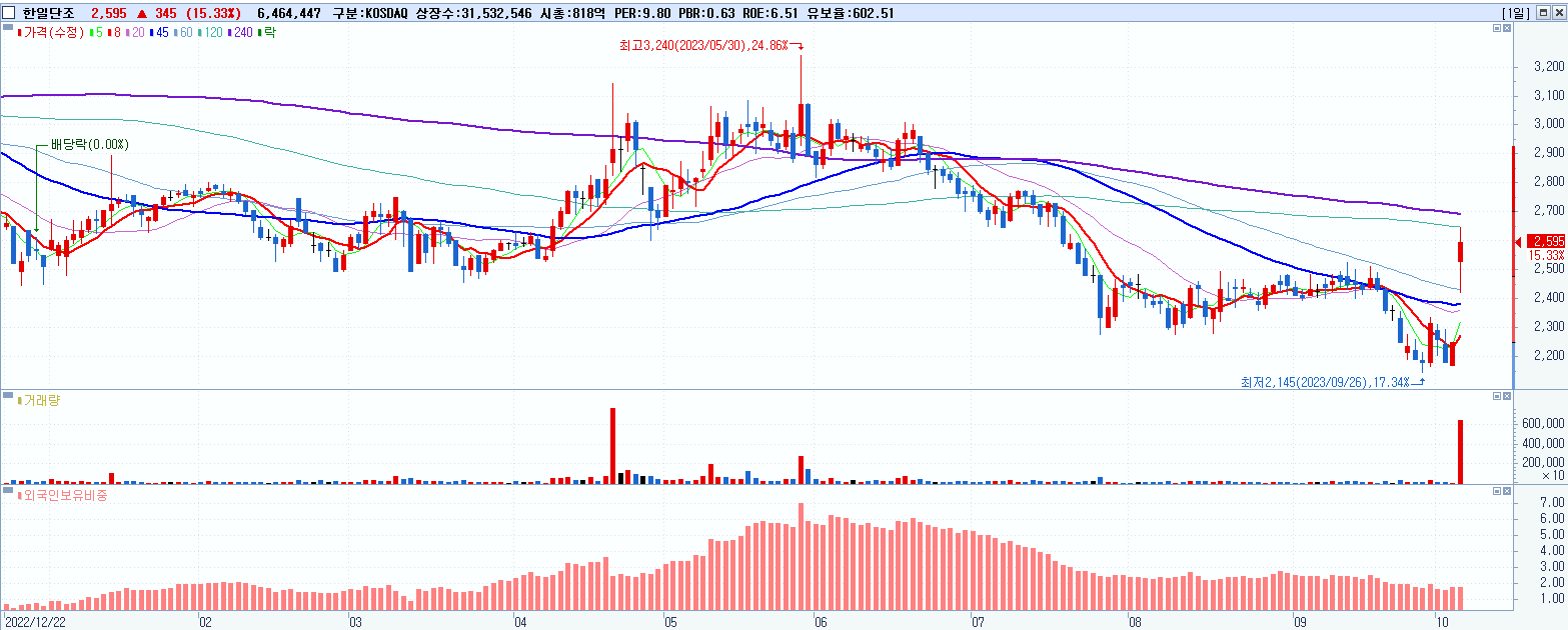 - 한일단조 (2,595원 ▲ 15.33% , 시총: 818억, 거래량: 6,546,323, 거래대금:166억)