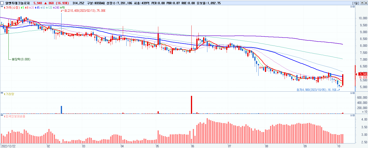 - 알엔투테크놀로지 (5,940원 ▲ 16.93% , 시총: 439억, 거래량: 390,285, 거래대금:22억)
