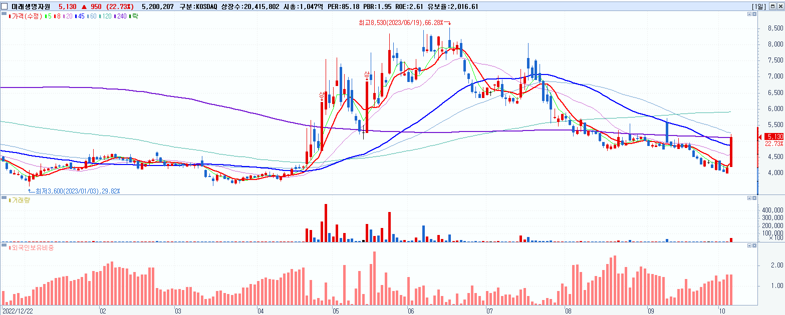 - 미래생명자원 (5,130원 ▲ 22.73% , 시총: 1,047억, 거래량: 5,249,342, 거래대금:261억)