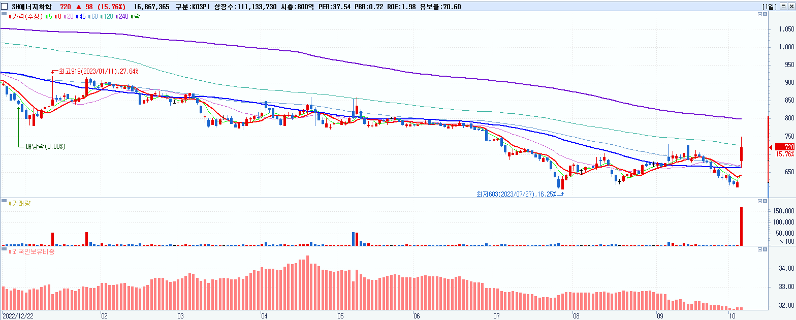 - SH에너지화학 (720원 ▲ 15.76% , 시총: 800억, 거래량: 16,947,730, 거래대금:121억)