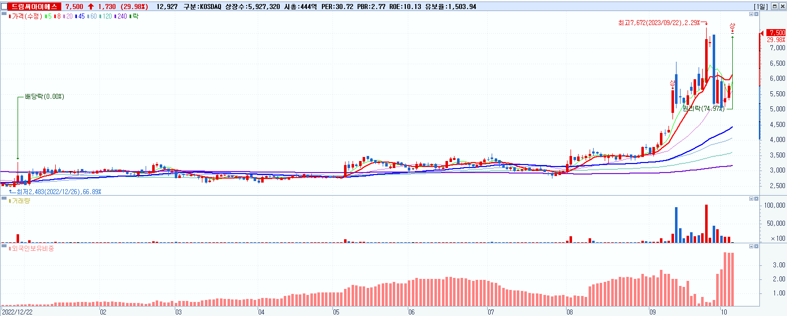 2.드림씨아이에스 7,500원 ▲ 29.98% (KOSDAQ, 223250)