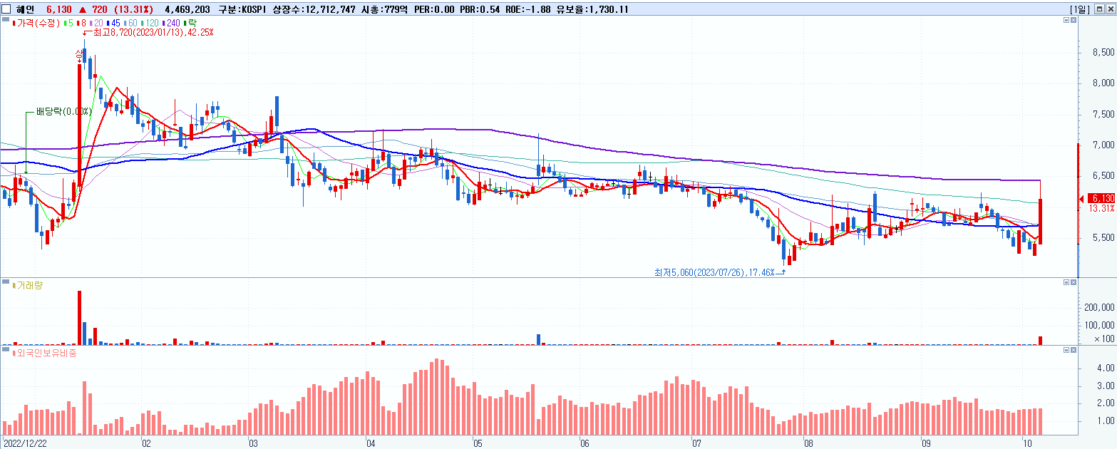 - 혜인 (6,130원 ▲ 13.31% , 시총: 779억, 거래량: 4,482,506, 거래대금:277억)