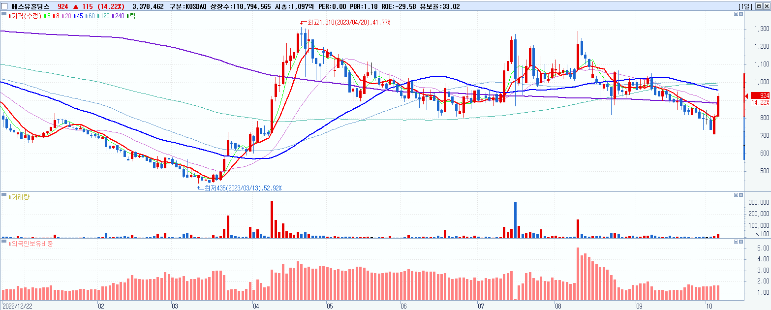- 에스유홀딩스 (924원 ▲ 14.22% , 시총: 1,098억, 거래량: 3,379,012, 거래대금:30억)