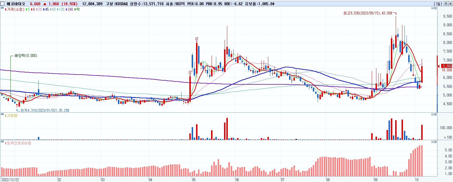 - 에코바이오 (6,660원 ▲ 18.93% , 시총: 904억, 거래량: 12,822,379, 거래대금:869억)