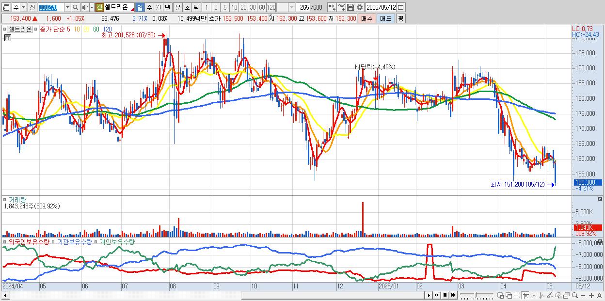 - 셀트리온 (151,800원 ▼ -3.92% , 시총: 338,499억, 거래량: 1,435,072, 거래대금:2,185억)