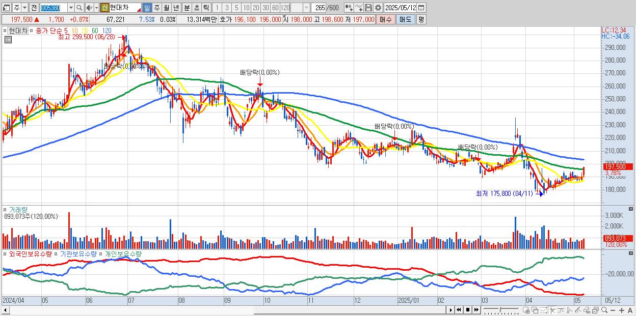 - 현대차 (195,800원 ▲ 3.11% , 시총: 410,037억, 거래량: 569,602, 거래대금:1,104억)