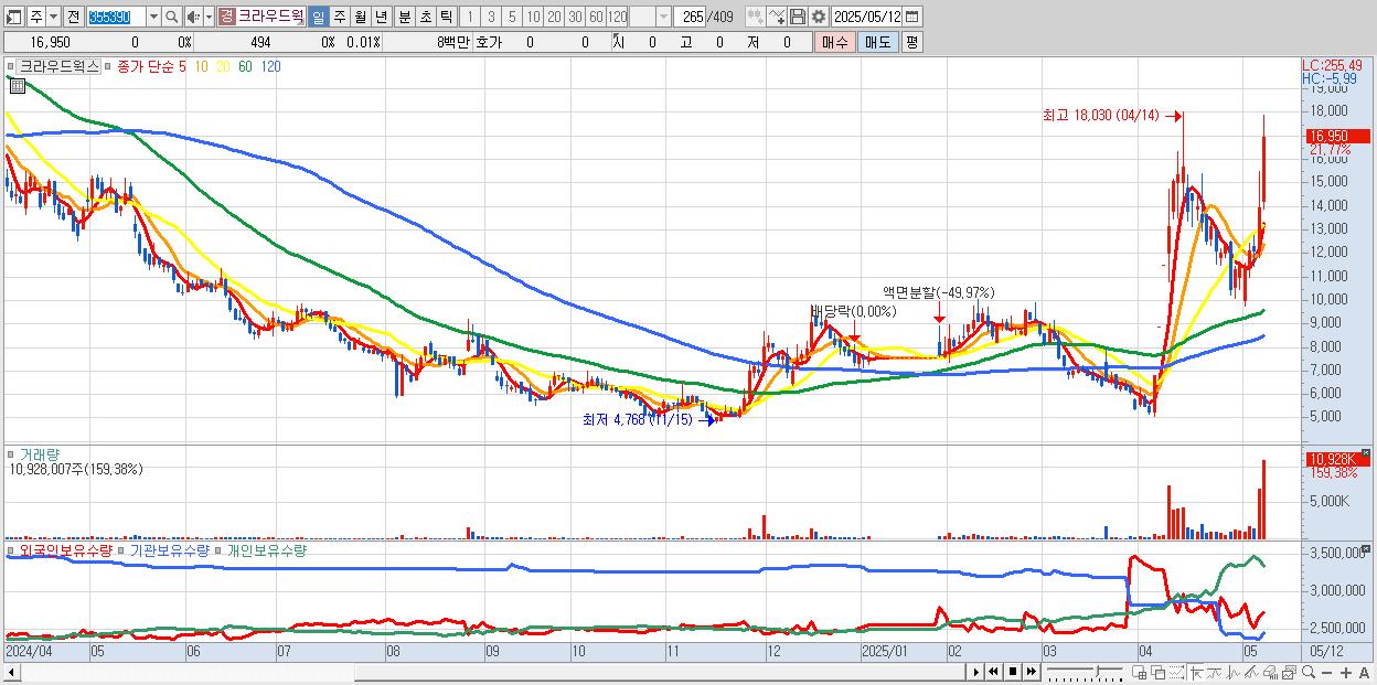 - 크라우드웍스 (16,950원 ▲ 21.77% , 시총: 1,578억, 거래량: 10,928,007, 거래대금:1,736억)