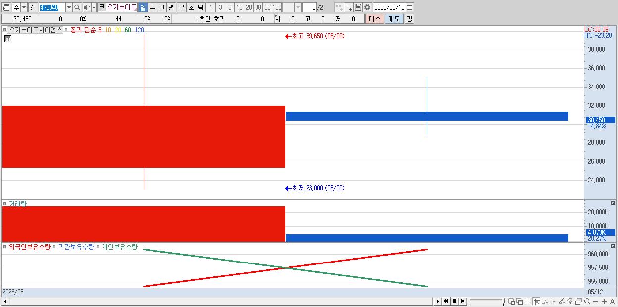 - 오가노이드사이언스 (30,450원 ▼ -4.84% , 시총: 1,981억, 거래량: 4,872,989, 거래대금:1,580억)