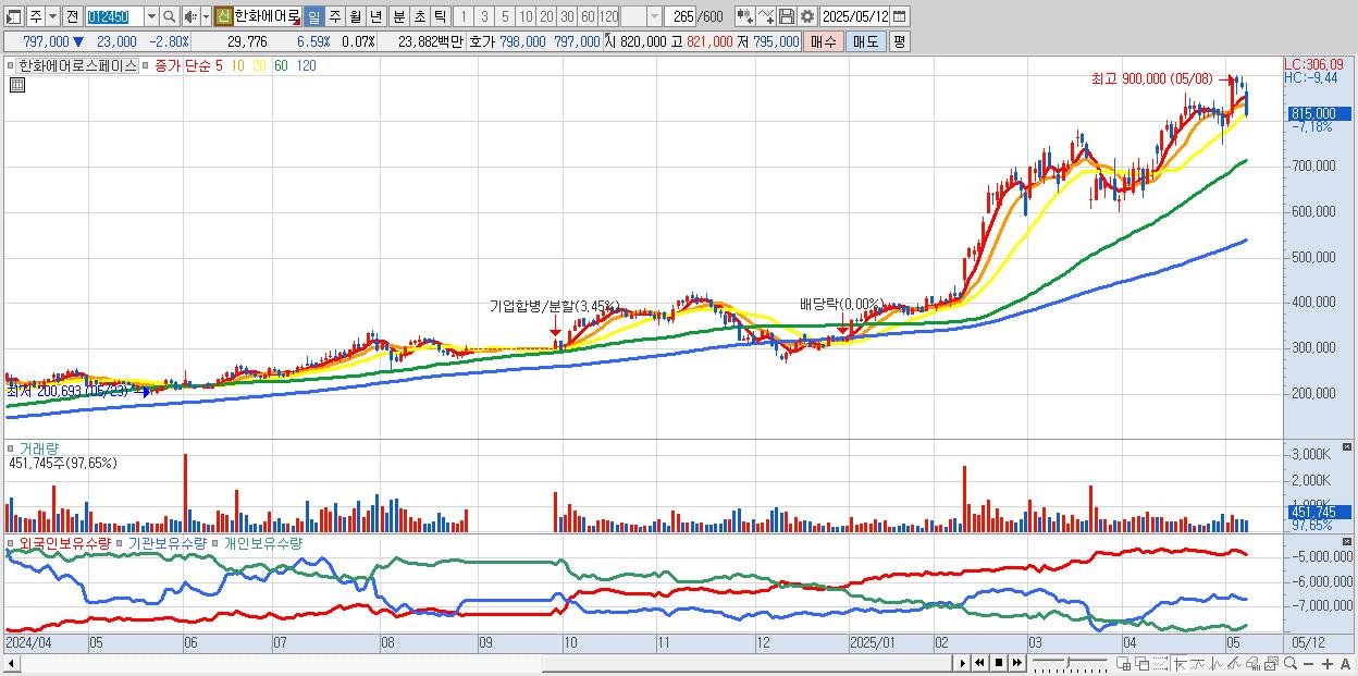 - 한화에어로스페이스 (820,000원 ▼ -6.61% , 시총: 373,766억, 거래량: 285,226, 거래대금:2,399억)