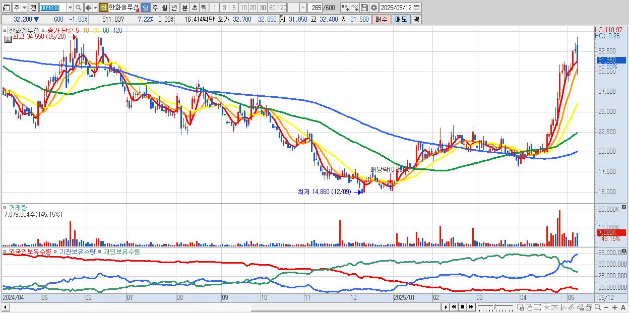 - 한화솔루션 (32,800원 ▲ 0.46% , 시총: 56,381억, 거래량: 3,258,319, 거래대금:1,081억)
