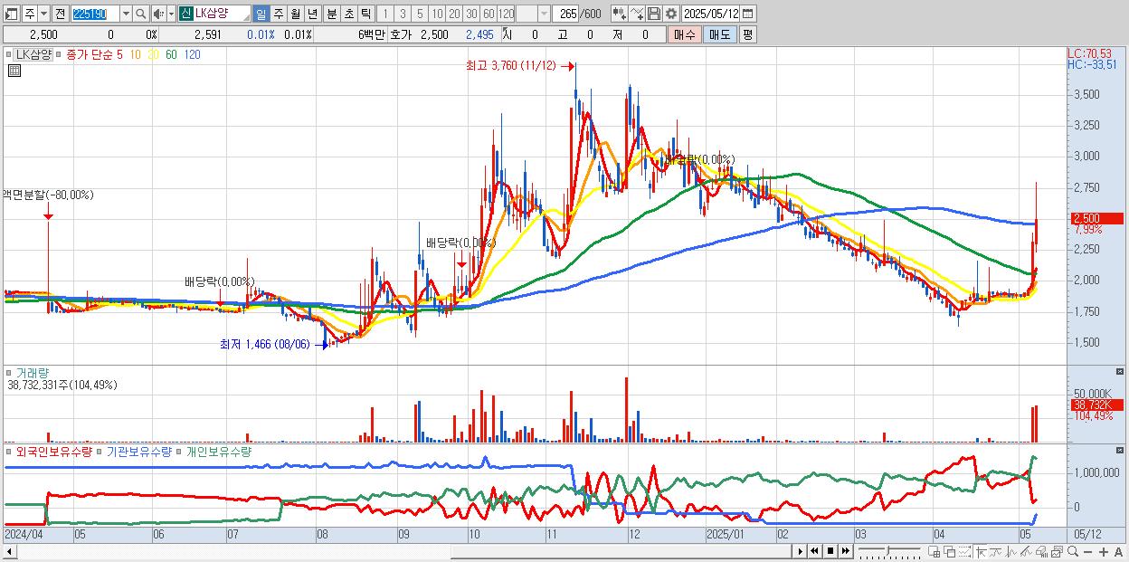 - LK삼양 (2,500원 ▲ 7.99% , 시총: 1,269억, 거래량: 38,732,331, 거래대금:994억)