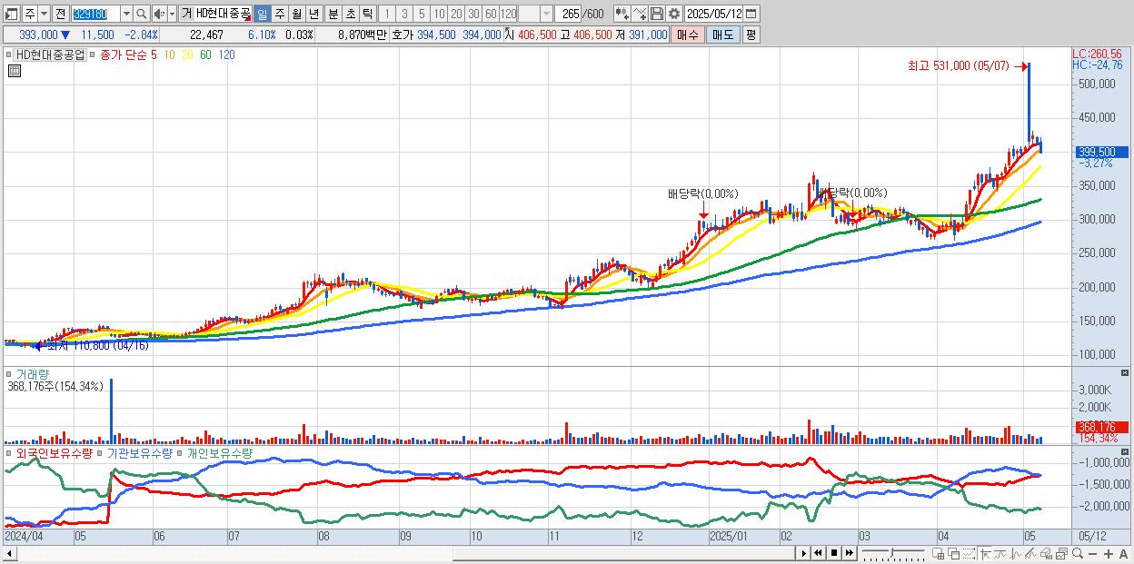 - HD현대중공업 (404,500원 ▼ -2.06% , 시총: 359,087억, 거래량: 258,468, 거래대금:1,054억)
