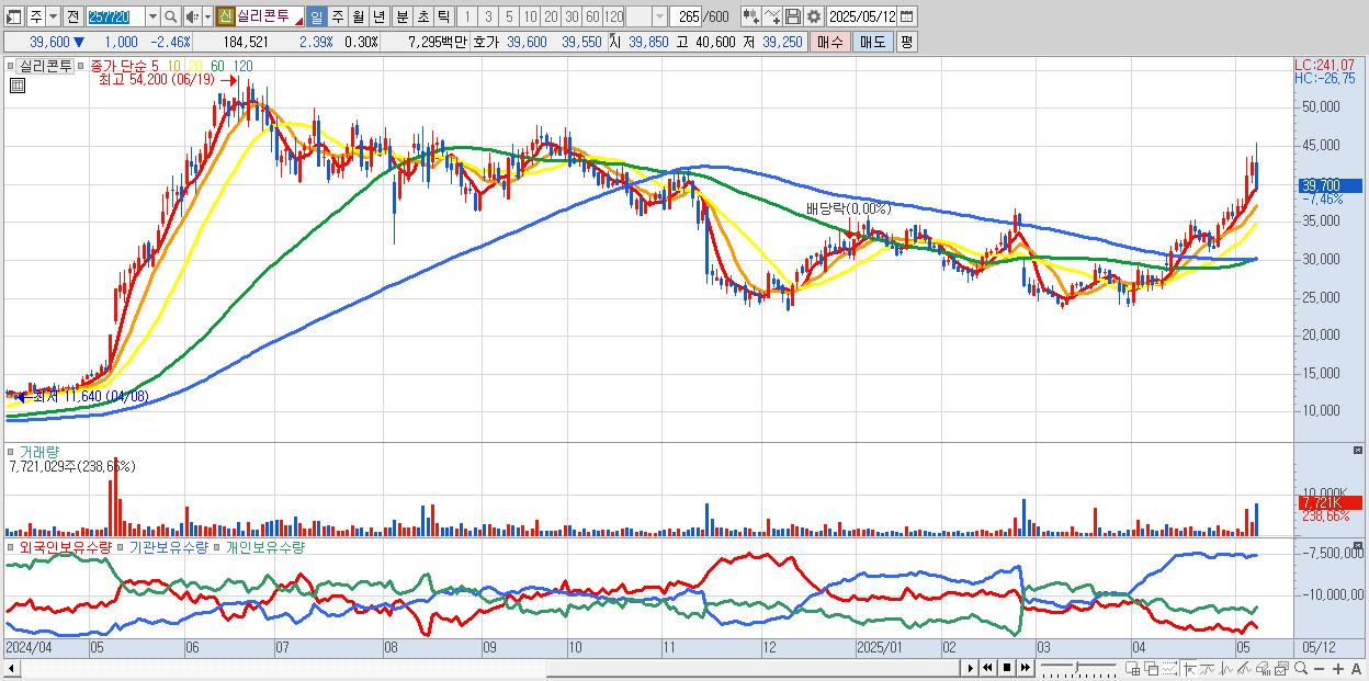 - 실리콘투 (40,600원 ▼ -4.81% , 시총: 24,836억, 거래량: 5,033,806, 거래대금:2,136억)