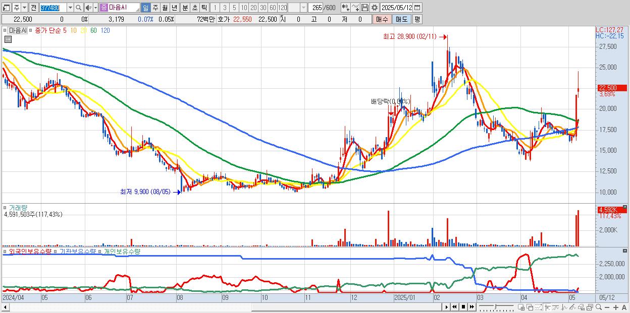 - 마음AI (22,500원 ▲ 3.69% , 시총: 1,518억, 거래량: 4,591,503, 거래대금:1,048억)