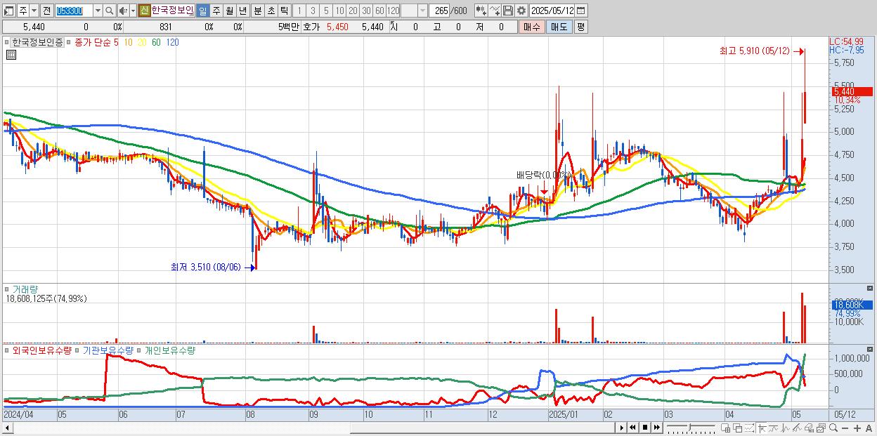- 한국정보인증 (5,440원 ▲ 10.34% , 시총: 2,309억, 거래량: 18,608,125, 거래대금:1,033억)