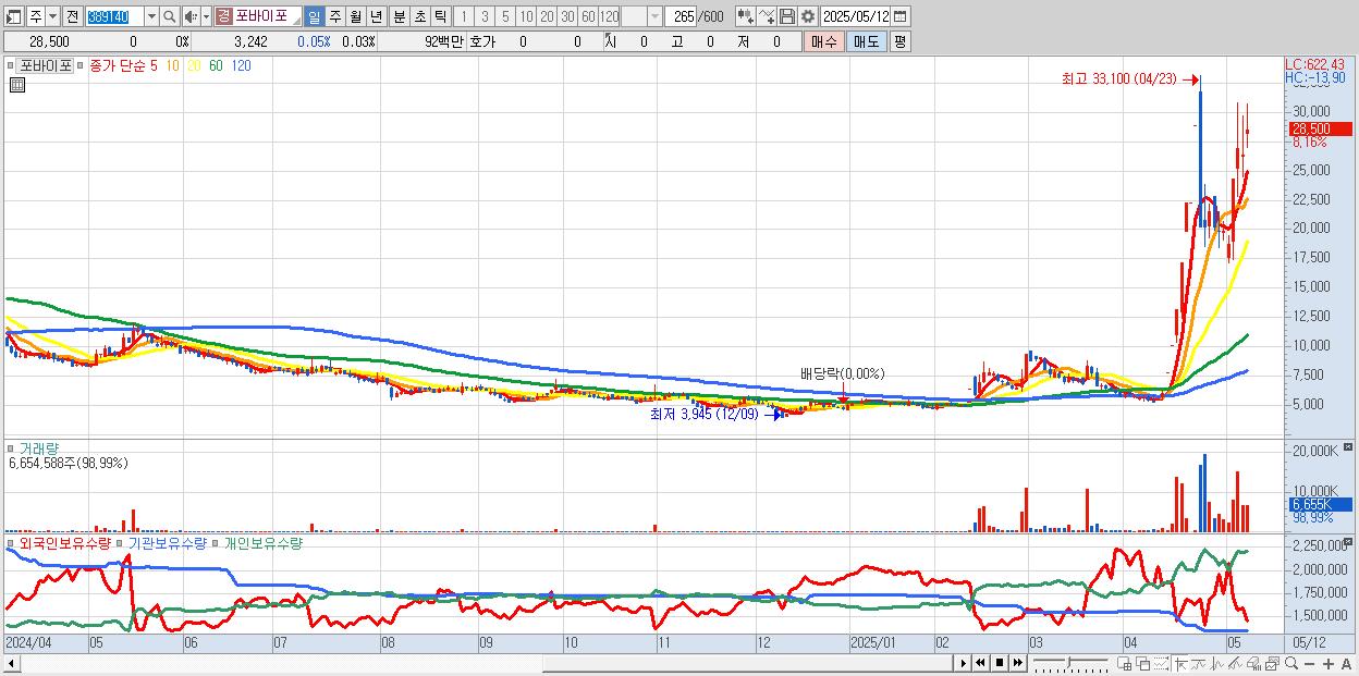 - 포바이포 (28,500원 ▲ 8.16% , 시총: 3,167억, 거래량: 6,654,588, 거래대금:1,912억)