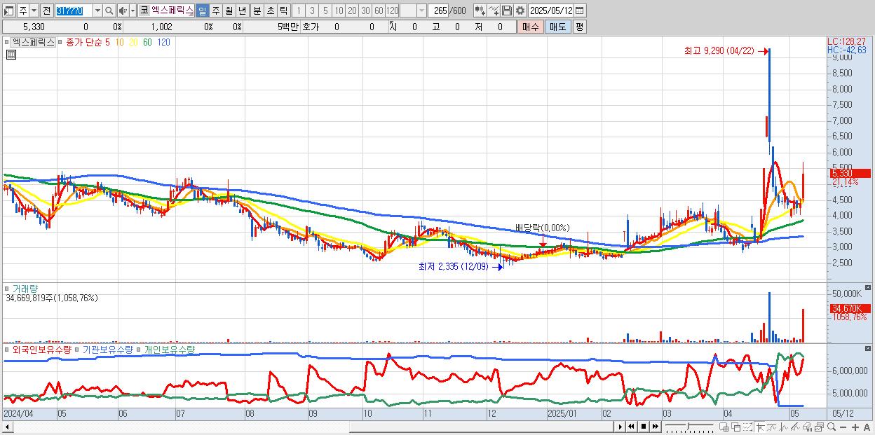 - 엑스페릭스 (5,330원 ▲ 21.14% , 시총: 1,408억, 거래량: 34,669,819, 거래대금:1,810억)