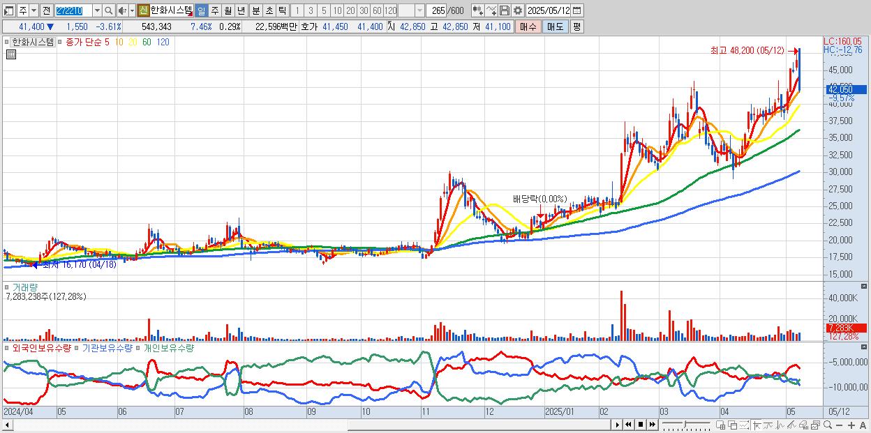 - 한화시스템 (42,950원 ▼ -8.32% , 시총: 81,141억, 거래량: 3,926,050, 거래대금:1,733억)