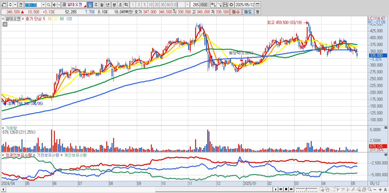 - 알테오젠 (336,000원 ▼ -2.61% , 시총: 179,151억, 거래량: 436,334, 거래대금:1,463억)
