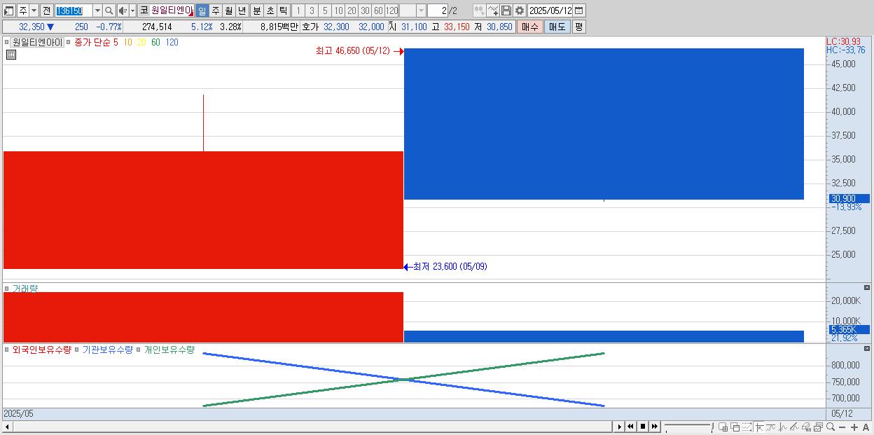 - 원일티엔아이 (32,600원 ▼ -9.19% , 시총: 2,732억, 거래량: 2,781,664, 거래대금:982억)
