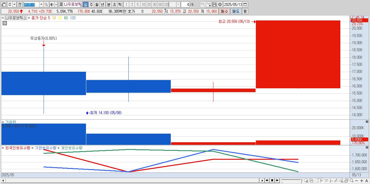 - 나우로보틱스 (20,550원 ▲ 29.73% , 시총: 2,579억, 거래량: 5,094,776, 거래대금:964억)