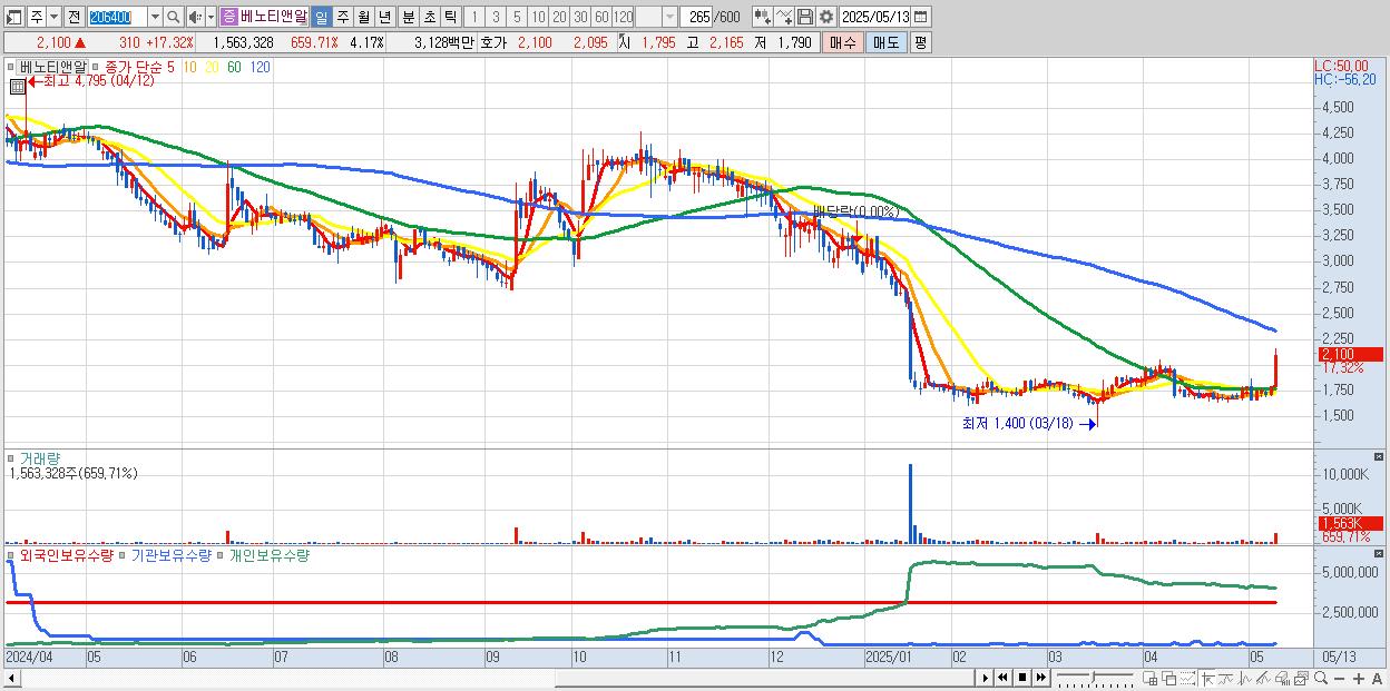 - 베노티앤알 (2,100원 ▲ 17.32% , 시총: 788억, 거래량: 1,563,328, 거래대금:31억)