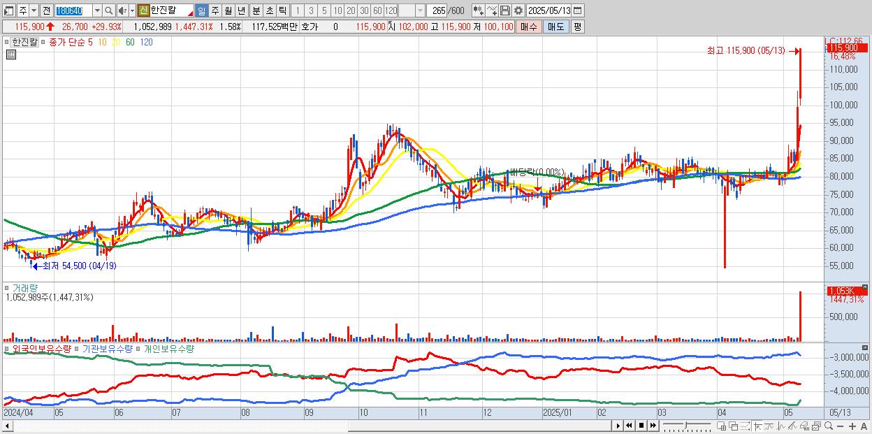 - 한진칼 (115,900원 ▲ 29.93% , 시총: 77,377억, 거래량: 730,295, 거래대금:813억)