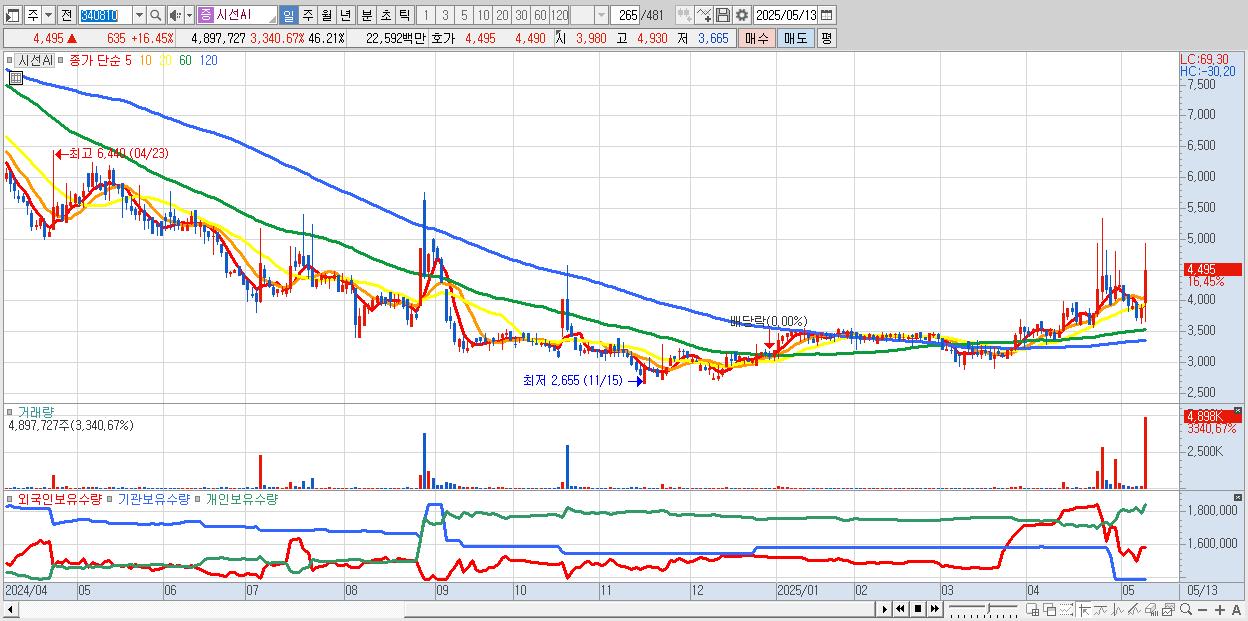- 시선AI (4,495원 ▲ 16.45% , 시총: 476억, 거래량: 4,897,727, 거래대금:226억)
