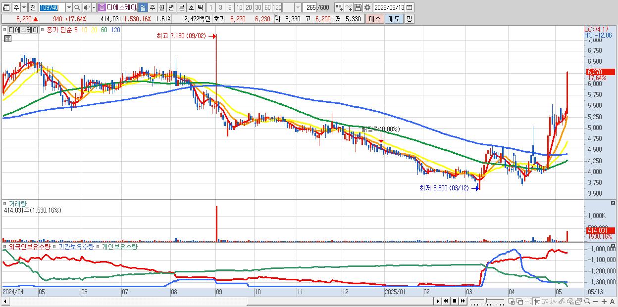 - 디에스케이 (6,270원 ▲ 17.64% , 시총: 1,612억, 거래량: 414,031, 거래대금:25억)
