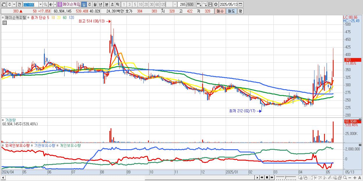 - 메이슨캐피탈 (383원 ▲ 17.85% , 시총: 583억, 거래량: 60,904,145, 거래대금:244억)