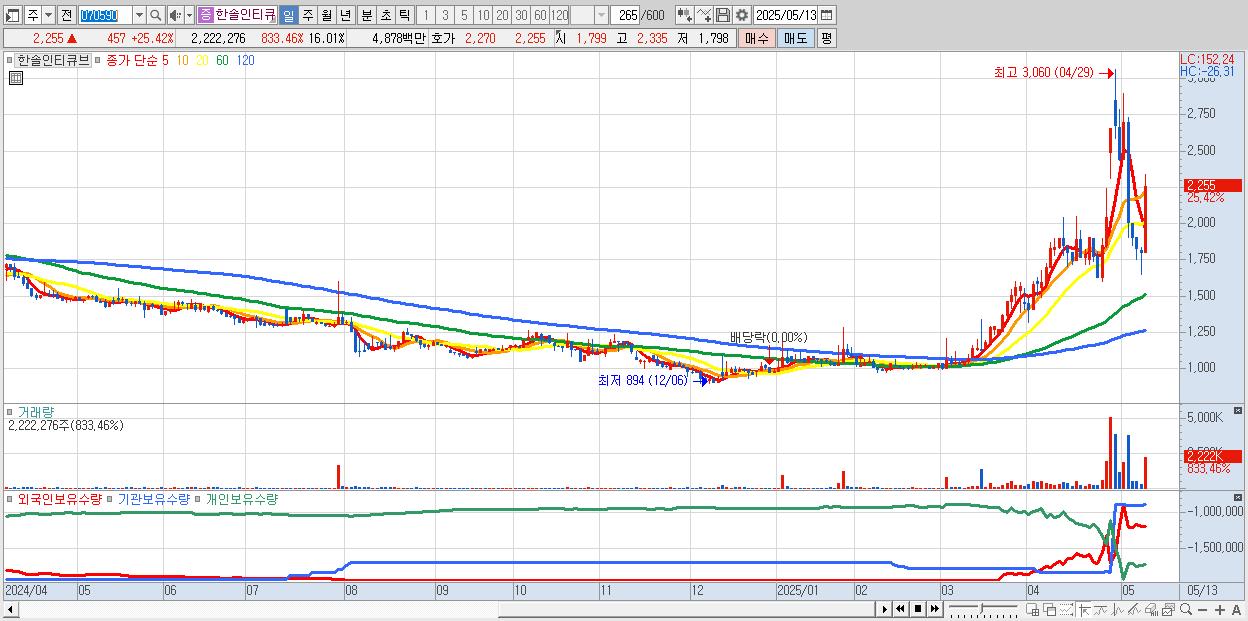 - 한솔인티큐브 (2,255원 ▲ 25.42% , 시총: 313억, 거래량: 2,222,276, 거래대금:49억)