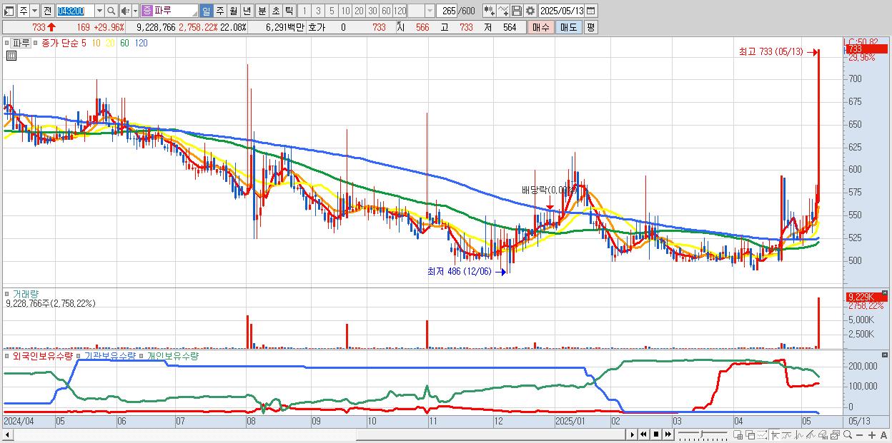 - 파루 (733원 ▲ 29.96% , 시총: 306억, 거래량: 9,228,766, 거래대금:63억)