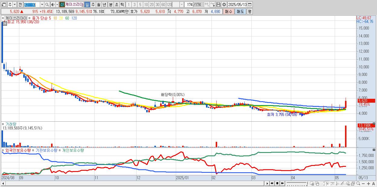 - 케이쓰리아이 (5,620원 ▲ 19.45% , 시총: 421억, 거래량: 13,189,569, 거래대금:738억)