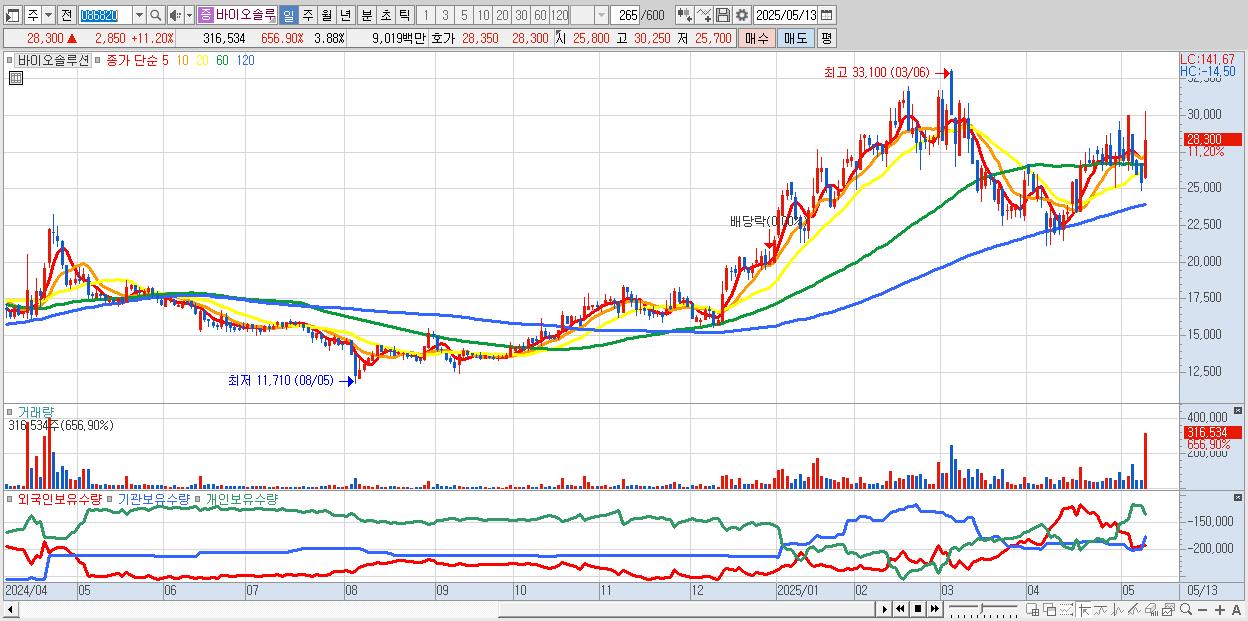 29.바이오솔루션 28,300원 ▲ 11.2% (KOSDAQ, 086820)