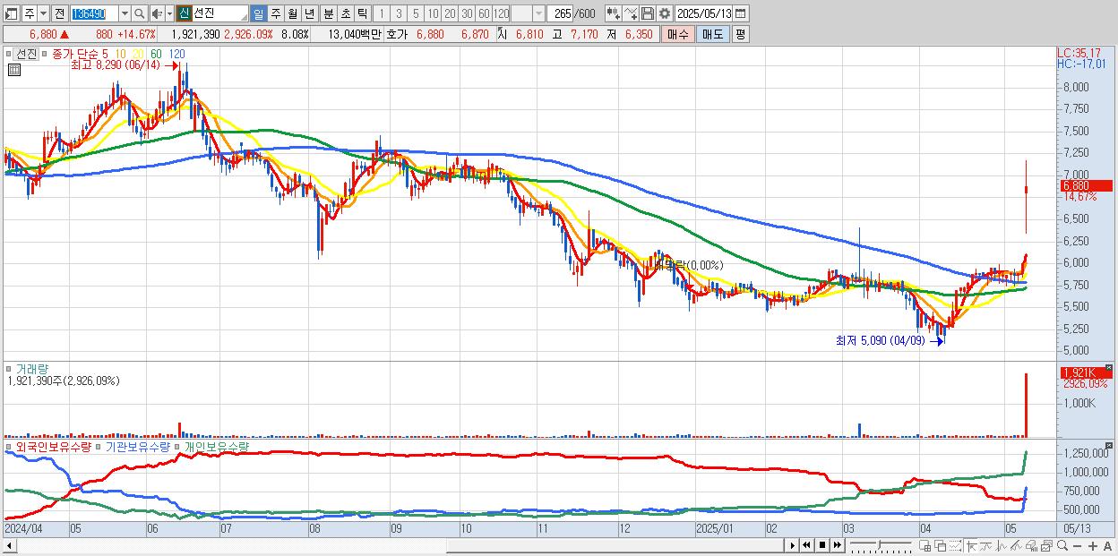 - 선진 (6,880원 ▲ 14.67% , 시총: 1,636억, 거래량: 1,921,390, 거래대금:130억)