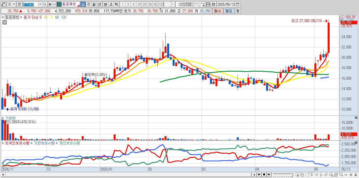 - 토모큐브 (26,700원 ▲ 27.14% , 시총: 3,517억, 거래량: 2,847,893, 거래대금:711억)
