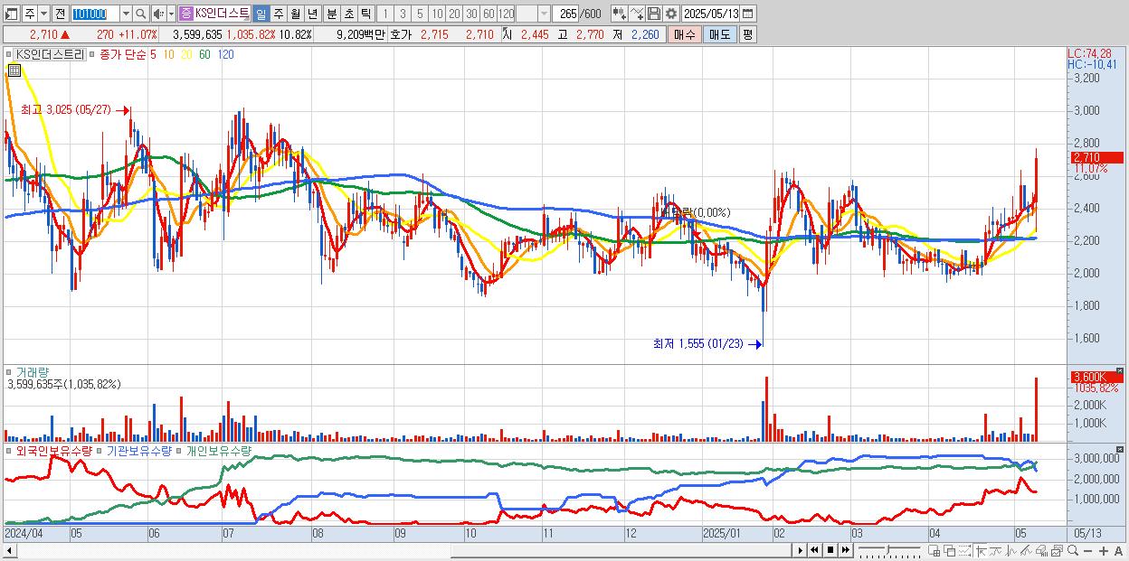 - KS인더스트리 (2,710원 ▲ 11.07% , 시총: 902억, 거래량: 3,599,635, 거래대금:92억)