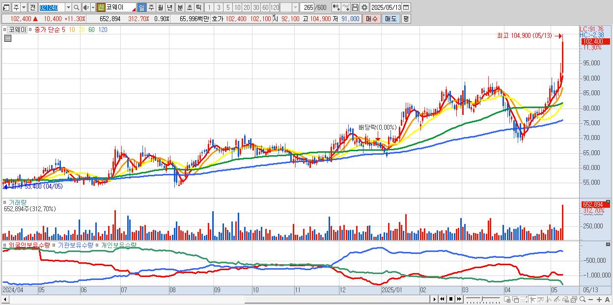 - 코웨이 (102,800원 ▲ 11.74% , 시총: 74,596억, 거래량: 593,692, 거래대금:600억)